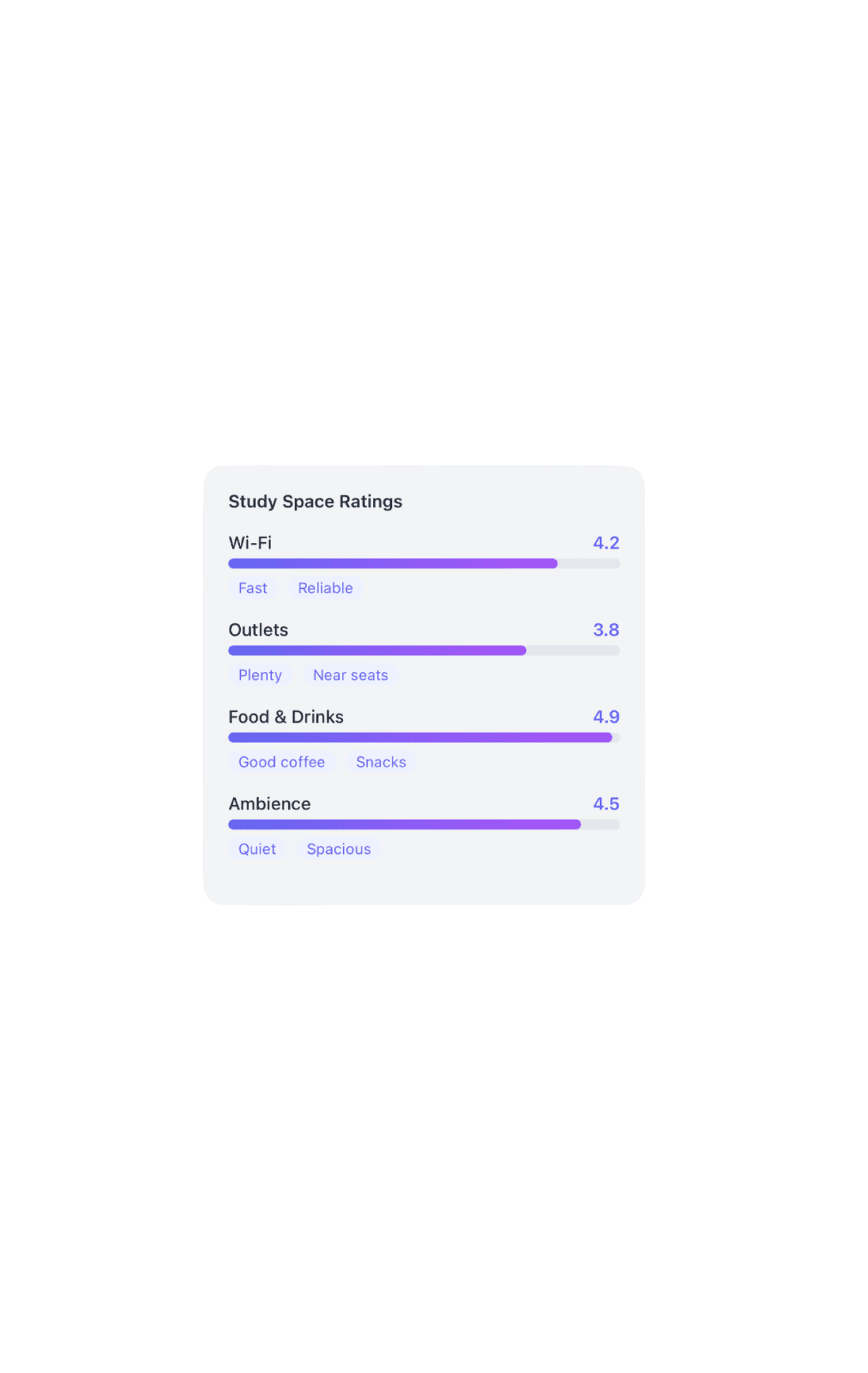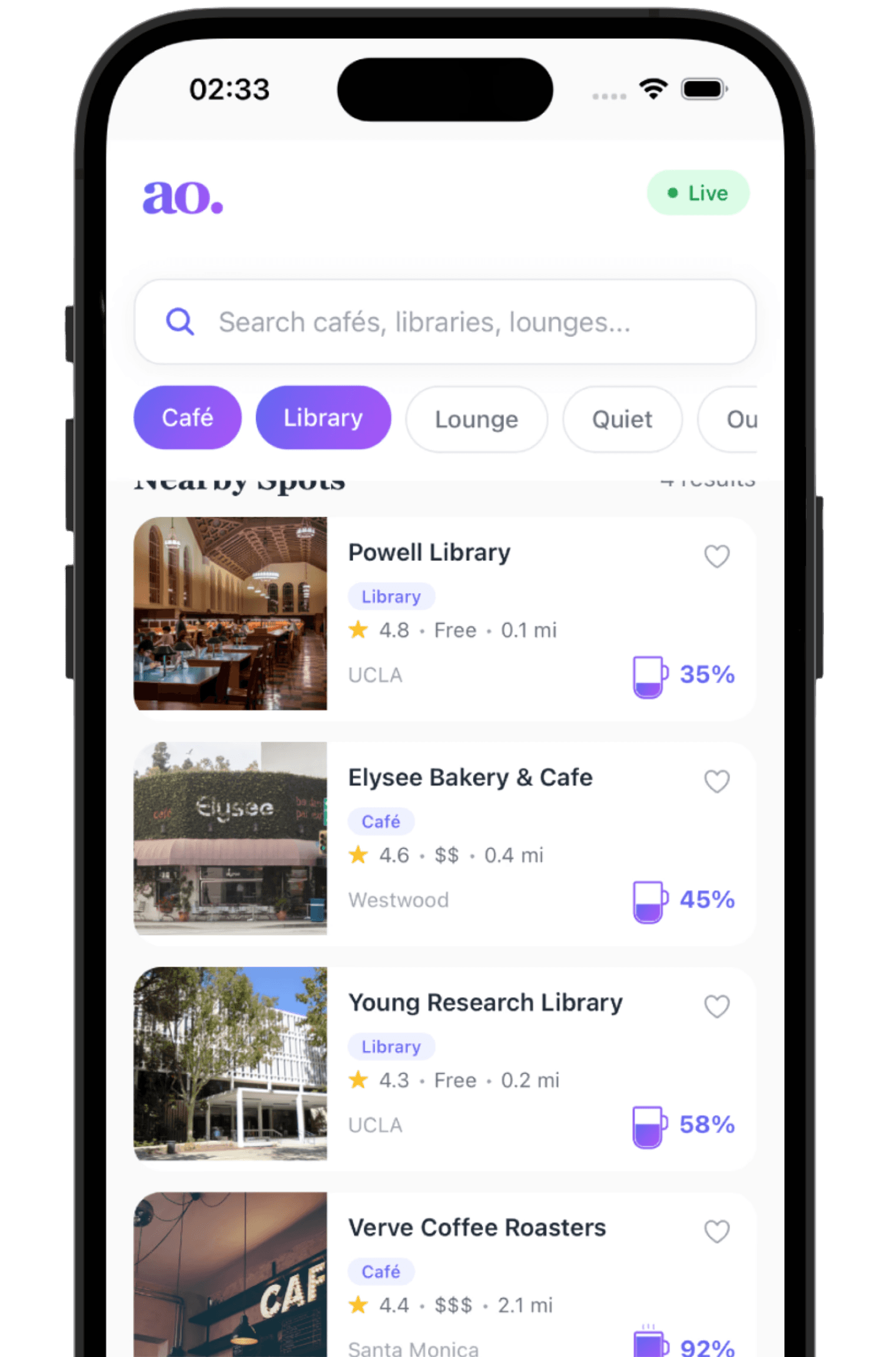 Live occupancy data, curated study spots, and everything you need to find your perfect workspace.